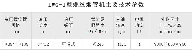 LWG-Ⅰ型螺紋煙管機(jī)是我公司專為鍋爐行業(yè)設(shè)計(jì)制造的滾壓螺紋煙火管的加工成形設(shè)備。在使用同樣煙火管數(shù)或等鋼耗的情況下,采用螺紋煙管技術(shù)其受熱面積與傳熱效率可比光管提高15%~20%,可極大地提高鍋爐的出力水平,提高鍋爐的效率,并可降低鍋爐本體的鋼耗。該機(jī)適用于在冷態(tài)條件下滾壓輸送流體用無縫管和一般用途鋼管,可專業(yè)使用于鍋爐、暖通等領(lǐng)域。