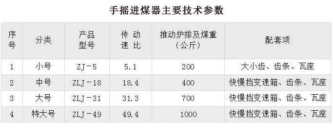 ZJ型與ZLJ型系列手搖進(jìn)煤器,是我公司專為小型鍋爐的型煤進(jìn)給而設(shè)計生產(chǎn)的配套產(chǎn)品。采用手搖齒輪變速增力方式,主要用于完成小功率型煤鍋爐燃燒室的給煤排渣機構(gòu)的動作。根據(jù)型煤鍋爐的爐膛數(shù)量可分為單爐膛、雙爐膛左右對稱(左、右手)兩種布置型式。