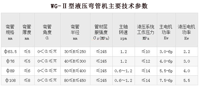 WG-Ⅱ型彎管機(jī)是我公司自行研制的具有彎制不大于180度的各種角度管件的專用彎管設(shè)備。本機(jī)為冷彎式液壓彎管機(jī),不用芯棒與加熱灌沙等工藝,適用于在冷態(tài)條件下彎曲輸送流體用無縫管和一般用途鋼管,可廣泛使用于鍋爐、化工、石油、暖通、金屬結(jié)構(gòu)及機(jī)械制造行業(yè)等領(lǐng)域。